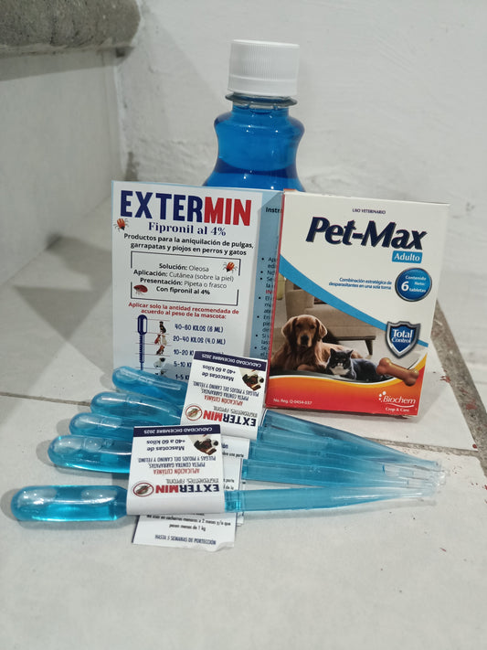 2 cajas desparasitante petmax + 20 pipetas antipulgas perros y gatos